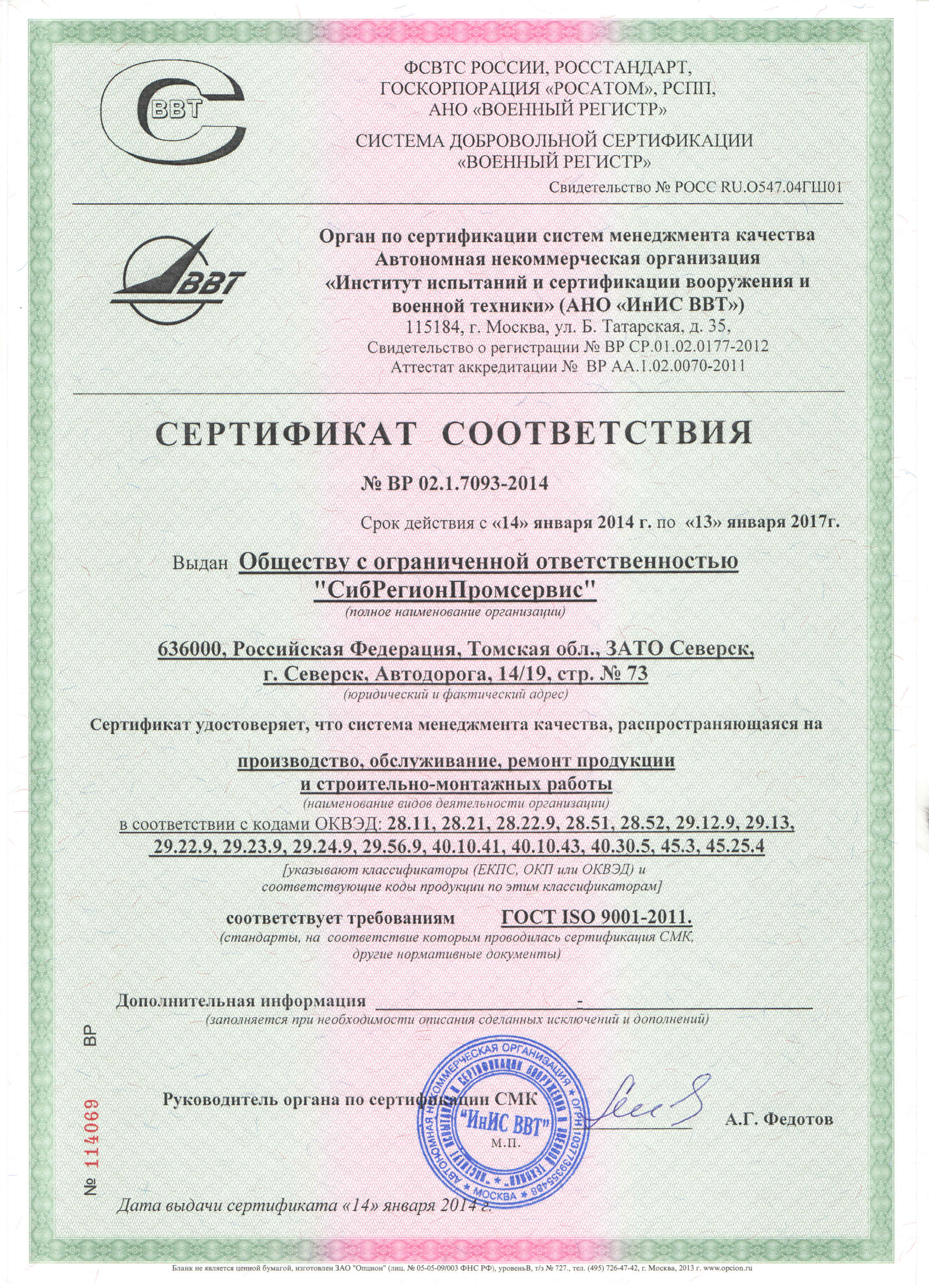 ООО «СибРегионПромсервис» получило сертификат о соответствии системы менеджмента качества требованиям стандарта ГОСТ ISO 9001-2011